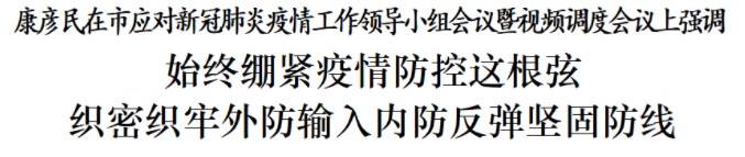 9月17日晚,在收聽(tīng)收看省應(yīng)對(duì)疫情工作視頻調(diào)度會(huì)議后,我市隨即召開(kāi)市應(yīng)對(duì)新冠肺炎疫情工作領(lǐng)導(dǎo)小組會(huì)議暨視頻調(diào)度會(huì)議,深入貫徹落實(shí)省會(huì)議精神,對(duì)全市疫情防控工作進(jìn)行再調(diào)度再部署。市委書(shū)記、市應(yīng)對(duì)新冠肺炎疫情工作領(lǐng)導(dǎo)小組組長(zhǎng)康彥民主持會(huì)議并講話。市委副書(shū)記、市應(yīng)對(duì)新冠肺炎疫情工作領(lǐng)導(dǎo)小組常務(wù)副組長(zhǎng)張效春出席會(huì)議。