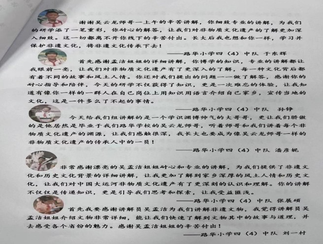 感謝信中提到,此次參觀給師生及家長(zhǎng)們留下了深刻的印象,非遺展示館的周到安排,講解員細(xì)致生動(dòng)的講解,讓孩子們更直觀的感受運(yùn)河千年歷史的厚度和非遺文化的魅力。其中葛寶暄小朋友在信中說道,這在他心里種下一顆傳承非遺文化的種子,并得到了很大的收獲……