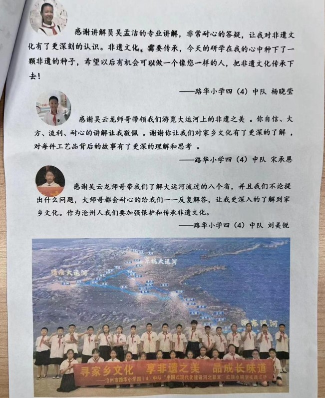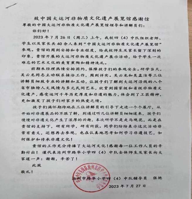 近日,中國(guó)大運(yùn)河非物質(zhì)文化遺產(chǎn)展示館收到一封來自滄州市路華小學(xué)四(4)中隊(duì)師生的感謝信,對(duì)非遺展示館為研學(xué)活動(dòng)提供的優(yōu)質(zhì)接待和專業(yè)講解表達(dá)了誠(chéng)摯感謝。