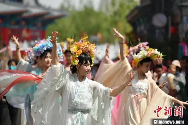 5月1日,演員在滄州市南川老街表演簪花巡游。苑立偉攝