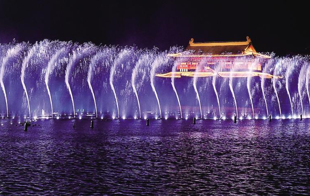 夜幕降臨,這片水域瞬間靈動起來。水柱、燈光、激光……多種元素創(chuàng)新融為一體,音樂噴泉蔚為壯觀,水幕電影繽紛絢爛,為市民帶來一場震撼的視聽盛宴。