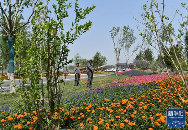 ↑5月12日,工人在滄州園博園內(nèi)養(yǎng)護花卉。