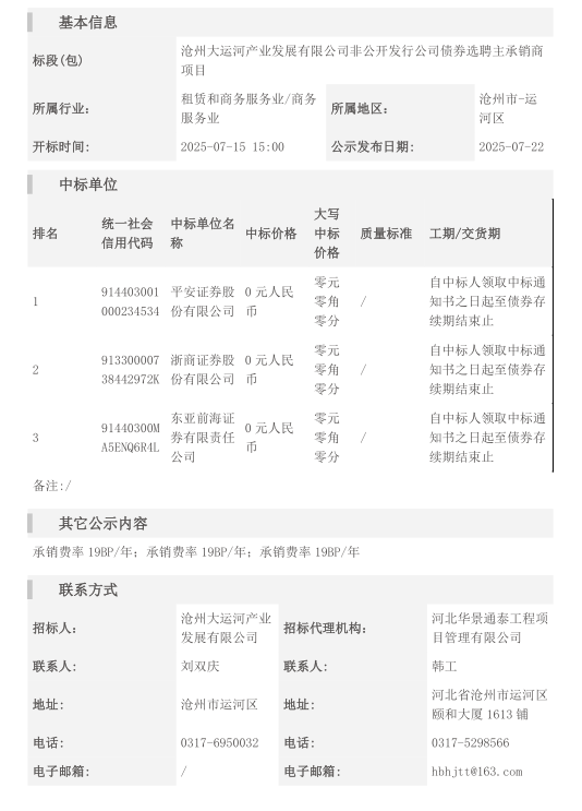 滄州大運河產(chǎn)業(yè)發(fā)展有限公司非公開發(fā)行公司債券選聘主承銷商項目中標(biāo)公告