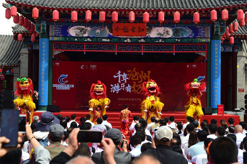 游客在滄州坊商街觀賞傳統(tǒng)舞獅表演。傅新春攝
